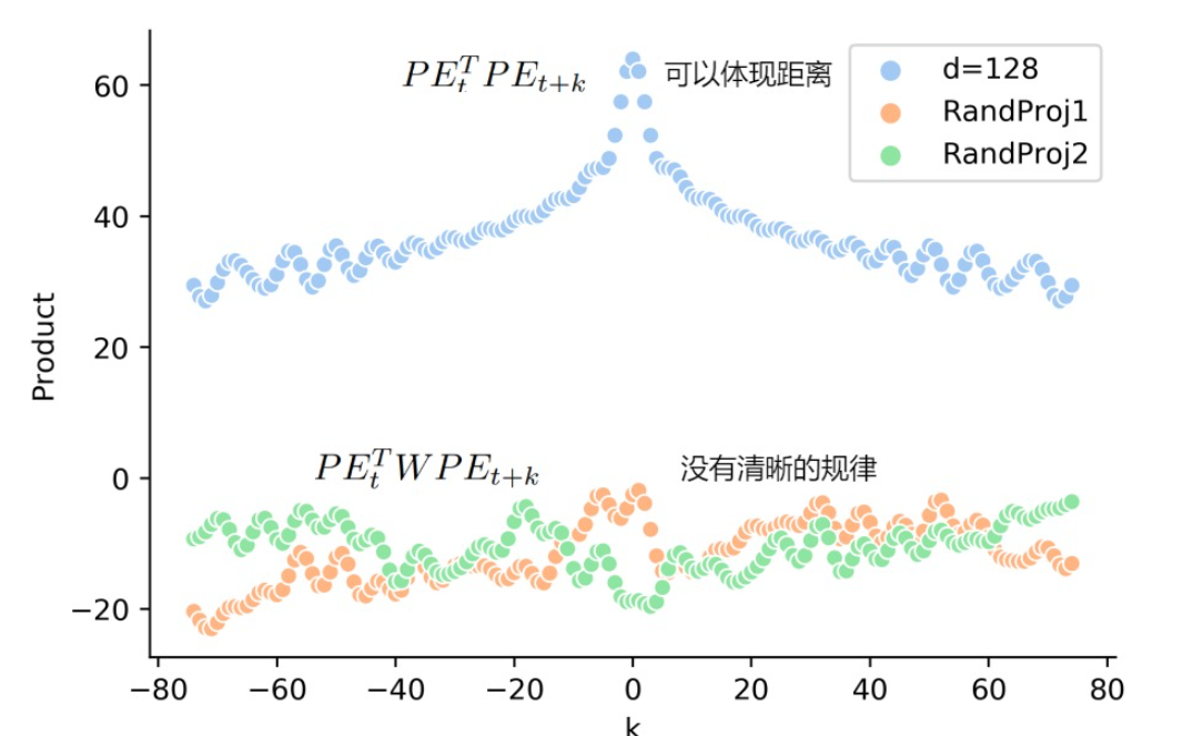 由上图可知,位置编码是和word_embedding加和在一起的,经过注意力层的Q和K点积之后,其远程衰减的特性消失了,那么其表达相对位置的能力就不存在了。Q和K点积的公式如下: