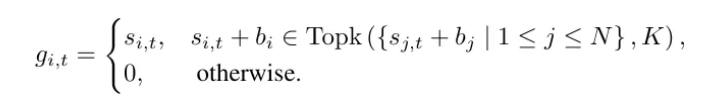 最后一个公式$s_{i, t}$表示第t个token对应第i个专家的概率,第三个公式表明,处了被选中的topk个专家,其余专家的概率都为0。第二个公式表示被选中的专家的的结果加权求和时的权重。